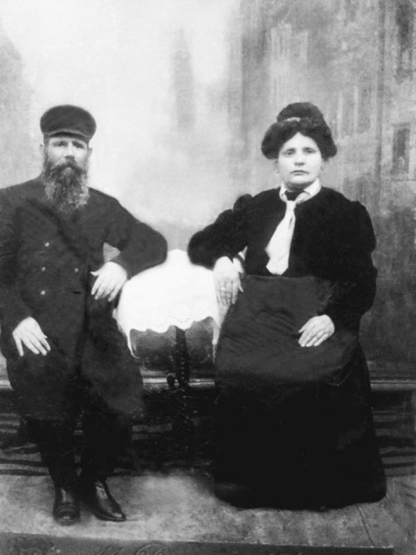 Только одна фотография сохранила родителей бабушек – моих прадеда и прабабку. Они сидят напряженные, не привыкшие фотографироваться, видимо надев для этой цели все лучшее. Прадед, сапожник Абрам Хазин (имя его сохранило мне отчество бабушек), в пальто и кепке, зажав в кулаки руки, трудами которых жила его большая семья. И прабабка, имени которой я не знаю, старушка с перекошенным ртом, в белом платочке, родившая 9 и вырастившая 7 детей: шестерых дочерей (Рейзл, Гитл, Фаня, Инда, Рися, Злата) и одного сына. Выглядят они как старик и старуха, хотя вряд ли им на этой фотографии намного больше 50.