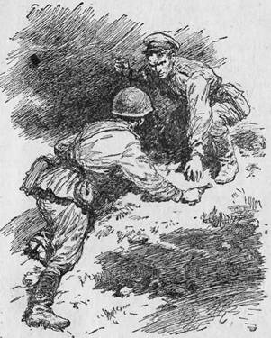 Сержант выскочил из укрытия и кинулся на врага, торопливо убегавшего к низине. Над позициями противника стали вспыхивать ракеты. Всё вокруг то озарялось бледным мер венным светом, то погружалось в ещё более плотную тьму. Прошить убийцу автоматной очередью ничего не стоило, но не этого хотел Костылёв. Сержант несколькими скачками настиг убийцу и внезапно ударил его автоматом в спину. От неожиданности человек неуклюже взмахнул руками и, выронив пистолет, упал. Не удержался на ногах и сержант.