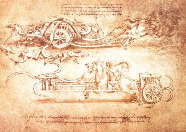 Остроумны изобретенные Леонардо землекопательные машины, состоящие из сложной системы рычагов, движущих одновременно десятки лопат. В виде курьеза можно указать также на изобретенные им колесницы с вращающимися серпами, которые, врезываясь в неприятельскую пехоту, должны были косить солдат. Удивительно, как Леонардо не пришло в голову применить эти или подобные снаряды, весьма напоминающие наши жатвенные машины, к уборке хлеба. По собственному признанию Леонардо, эти «колесницы с серпами» не оправдали его надежд, так как лошади пугались и производили смятение не во вражеских, а в своих рядах. Гораздо более важны чертежи и объяснения да Винчи, относящиеся к сверлению пушечных жерл и к отливке различных частей орудия. Особенно интересовался он различными бронзовыми сплавами, тем более, что бронза была ему нужна еще для памятника Франческо Сфорца. Весьма подробно исследовал Леонардо обстоятельства полета снарядов, интересуясь этим предметом не только как артиллерист, но и как физик. Он разбирал такие вопросы, как, например, какую форму и величину должны иметь зерна пороха для более скорого сгорания или для более сильного действия? Какой формы должна быть картечь для более быстрого полета? На многие из таких вопросов исследователь отвечает вполне удовлетворительно.