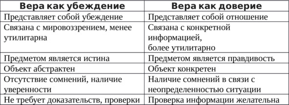 Кроме того, доверие связано с реально воспринимаемыми объектами (людьми, информацией), в то время как иррациональная вера может проявляться в отношении абстрактных объектов – того, что реально не наблюдаемо и не воспринимаемо нашими органами чувств.