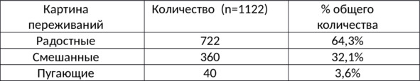 Статистика, полученная опросом 1122 респондентов еще на основе «старой» версии анкеты NDERF, позволяет представить общую картину распределения «радостных», «смешанных» и «пугающих» переживаний приводится в форме следующей таблицы.