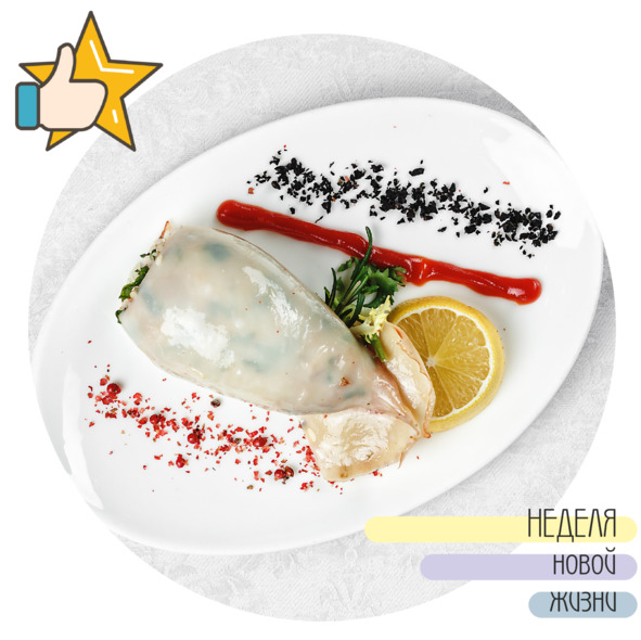 Тушку кальмара, очищенную и промытую фаршируем начинкой из риса, бекона и зелени и готовим в предварительно разогретой до 200⁰ С духовке 5 минут. При подаче украшаем лимоном и томатным соусом.