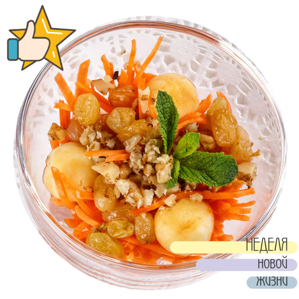 Подготовленные морковь и яблоки нарезаем мелкой соломкой, соединяем с предварительно распаренным в горячей воде и отжатым изюмом, добавляем мед, все тщательно перемешиваем до равномерного распределения ингредиентов. При подаче, салат выкладываем в креманку или коктейльный бокал, сверху посыпаем измельченным грецким орехом и декорируем мятой.