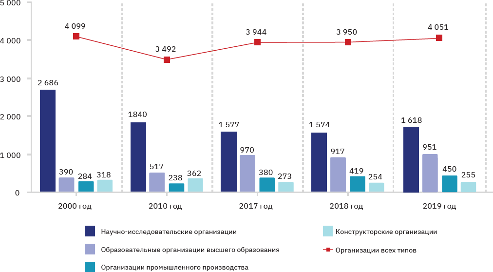 Рисунок 2.1.1 – Организации, выполнявшие исследования и разработки в России в период с 2000 по 2019 год
