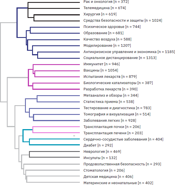 Рисунок 2.4.1 – «Генеалогическое древо» 30 исследовательских тем, связанных с коронавирусом, через поисковые запросы COVID-19 или SARS-CoV-2 (по данным WoS за 2020 г)*