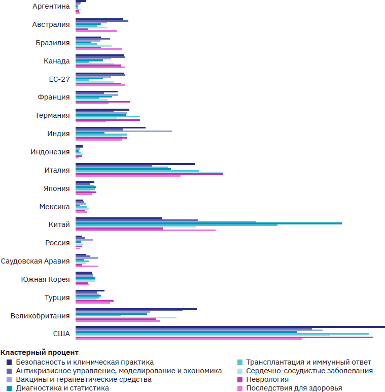 Каждая страна G20 внесла свой вклад в публикации в тематических кластерах (рис. 2.4.2). Исследовательская активность стран по тематическим кластерам в некоторой степени отражает прогресс пандемии и приоритеты по мере развития события. Относительно развитая исследовательская база стран G20 позволила им стать активными участниками исследования COVID-19, особенно США, Индия, Бразилия и Россия. Самыми крупными участниками исследования стали Регион ЕС-27 (пять кластеров – «Неврология», «Сердечно-сосудистые заболевания и диабет», «Антикризисное управление», «Моделирование и экономика», «Вакцины и терапевтические препараты», «Последствия для здоровья»), США (два кластера – «Безопасность и клиническая практика» и «Трансплантация и иммунный ответ») и Китай (один кластер – «Диагностика и лечение»). Россия оказалась единственным членом G20, который не участвовал во всех тематических кластерах. Нами не были опубликованы исследования по тематическому блоку «Трансплантация и иммунный ответ»[149].