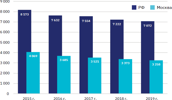 Рисунок 2.6.2 – Сведения о количестве издаваемых журналов в городе Москве за 2015–2019 годы