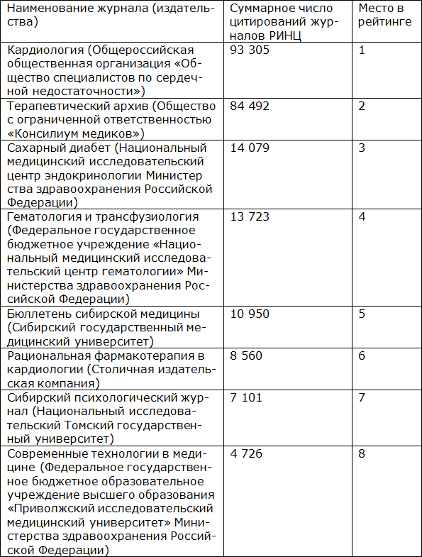 Значимость и востребованность в научном сообществе оценивается по показателю цитируемости. Оценивая уровень научных журналов по суммарному числу цитирований журналов в РИНЦ составлен рейтинг 15 журналов. Первое место занимает журнал «Кардиология», на втором месте по цитируемости находится журнал «Терапевтический архив», на третьем месте – журнал «Сахарный диабет» (табл. 2.6.1).