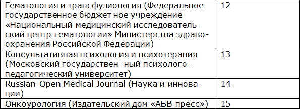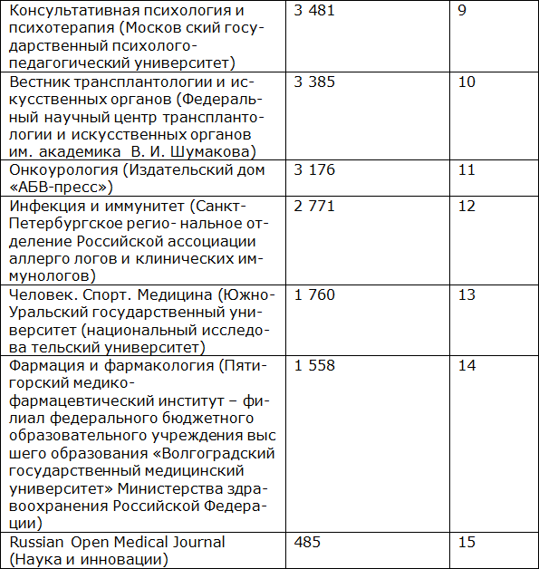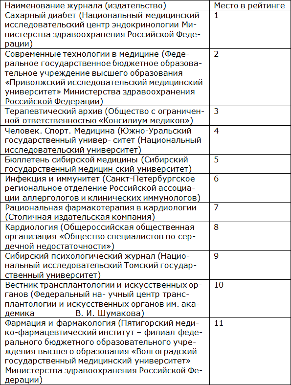 По интегральному показателю журналов в системе рейтинга Science Index первое место занимает журнал «Сахарный диабет», на втором месте – «Современные технологии в медицине», на третьем месте – журнал «Терапевтический архив» (табл. 2.6.2).
