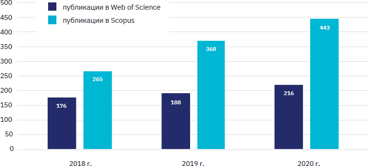 По данным за 2018–2020 годы отмечается рост публикаций медицинских организаций Департамента здравоохранения г. Москвы в международных реферируемых базах знаний (рис. 2.6.4). База научных продуктов Web of Science включена в KPI национального проекта «Наука».