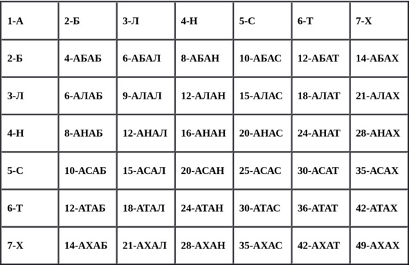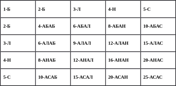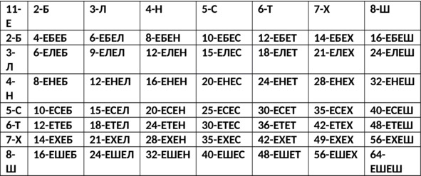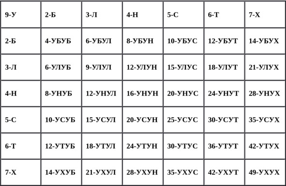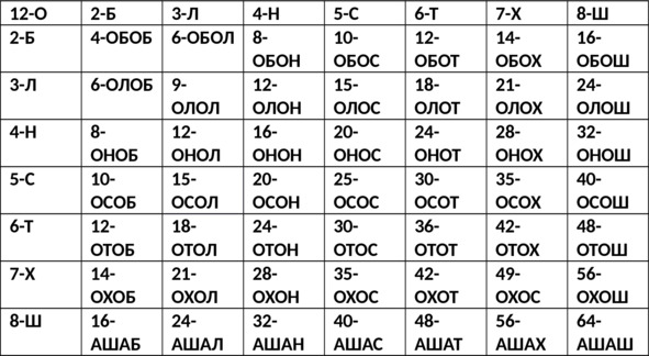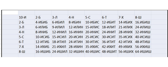 В триадной форме: биб, бил, бин, бис, бит, бих, биш; либ, лил, лин, лис, лит, лих, лиш; ниб, нил, нин, нис, нит, них, ниш; сиб, сил, син, сис, сит, сих, сиш; тиб, тил, тин, тис, тит, тих, тиш; хиб, хил, хин, хис, хит, хих, хиш; шиб, шил, шин, шис, шит, ших, шиш.