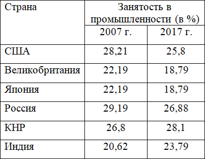 Как видно из Таблицы 1., процент занятых в сфере материального производства снижается во всех странах за исключением новых «мастерских мира», – КНР и Индии. Одновременно, во всех странах уменьшается доля занятых в сельском хозяйстве и возрастает занятость в сфере услуг.