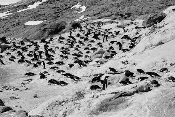 Когда строительный бум заканчивается, наступает мирный и спокойный летний период жизни колонии. Поодиночке, группами или парами пингвины прохаживаются по своей территории, о чем-то воркуя друг с другом.
