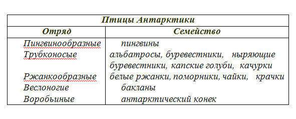 В видовом отношении Антарктика бедна птицами: 18 видов пингвинов, два вида поморников, несколько видов альбатросов. В летнее время в Антарктику с севера прилетают буревестники, чайки, бакланы и др.