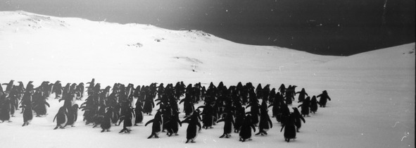 Ответ не заставил себя ждать – когда мы подошли к восточному берегу полуострова, перед нами открылось фантастическое зрелище: там, вдали у горизонта у открытой воды, по припаю в строну полуострова Ардли, извиваясь черной лентой в несколько километров, в нашу сторону шло несметное число пингвинов Папуа. Цепочка извивалась, видимо, пингвины обходили торосы, останавливались, отдыхали, дожидались отставших, затем снова продолжали движение. Их было несколько тысяч. Те, которые вышли на берег, не разбегались, а спокойно ждали отставших. Мне показалось, что после того как пингвины вступали на берег острова, они поворачивались в сторону приближающихся сородичей, как бы ожидая, когда все племя придет на место будущей колонии.