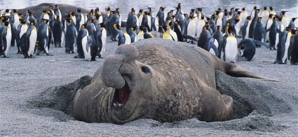 Императорские пингвины – всю жизнь проводят среди льдов в океане, и никогда не выходят на берег, могут оставаться под водой в течение 15 минут, нырять на глубину до 35 м, голодать до 9 недель во время высиживания яйца при холоде до – 60˚С, выращивать потомство в мае – в то время когда в Антарктике самая низкая температура на Земле. Высиживание птенца обычно берет на себя самец, а самка добывает еду в океане.