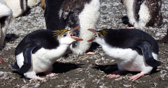 Хохлатые пингвины строят свои гнезда по соседству с гнездами альбатросов. Для пингвинов это очень выгодное соседство: охраняя свои яйца и своих птенцов от хищников (например, от поморников и каракар), альбатросы заодно защищают и соседей.