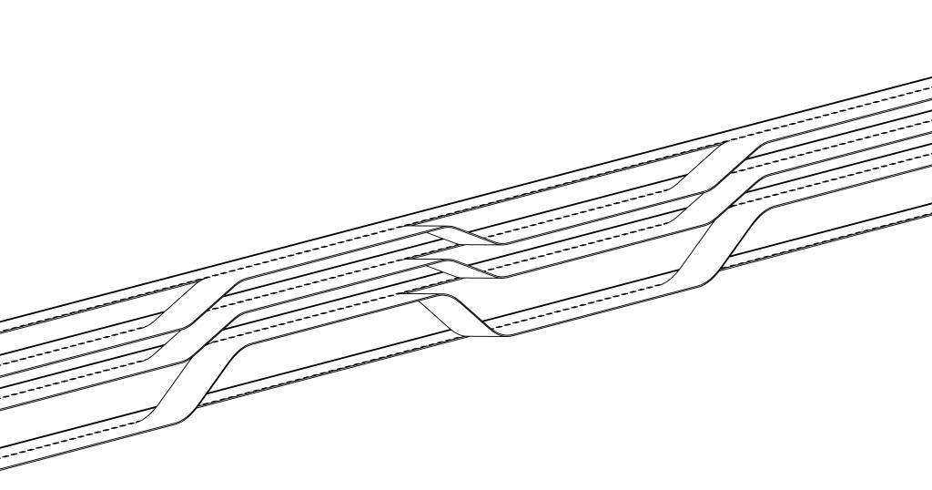 Ниже показано, как автомобили могут поступательно перемещаться по эстакаде благодаря применению волнообразной уплощенной полосы движения, которая одним своим уплощением смыкается на одном своем уровне с гладкой одноуровневой полосой движения одного этажа, а следующим своим уплощением смыкается на другом уровне с гладкой одноуровневой полосой движения другого этажа.