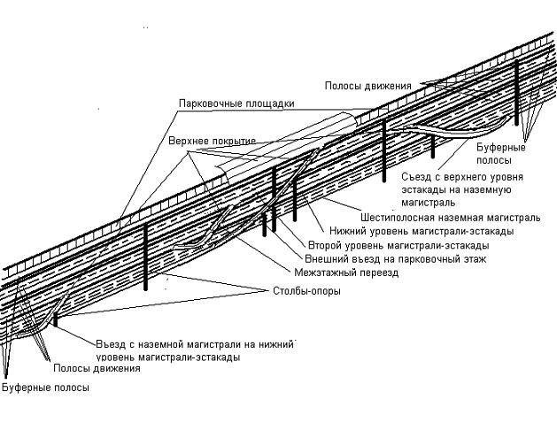 Магистраль-эстакада располагается вдоль оси магистрали, но может быть при необходимости отведена от нее в сторону.