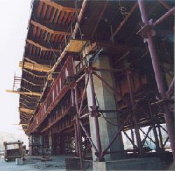 На строительной площадке затем ведут укрупнительную сборку, после чего собранные балки устанавливают в проектное положение кранами. Пролетные строения эстакад неразрезной или рамной системы с пролетами более 30-40 метров монтируют из коротких блоков, непосредственно устанавливаемых в пролет. Простейший способ такой сборки – укладка блоков на сплошных подмостях с последующим их объединением путем омоноличивания стыков и натяжения продольной арматуры. Такой способ требует возведения большого количества подмостей и ведет к загромождению подэстакадного пространства.
