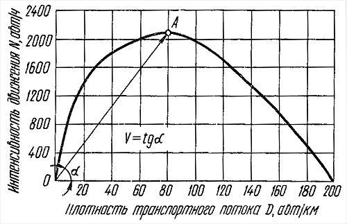 Пользуясь уравнением и диаграммой, можно определять характеристики транспортного потока. Так, средняя скорость выражается через тангенс угла наклона прямой, соединяющей начало координат с точкой, координаты которой характеризуют определенную интенсивность и плотность (N/D). Максимально возможная при данных условиях интенсивность движения, как это следует из диаграммы, достигается при определенной плотности транспортного потока (точка A на диаграмме) и называется пропускной способностью полосы движения или дороги в целом. Характерно, что при плотности потока, большей, чем в точке A, интенсивность движения снижается. Объясняется это тем, что при большой плотности движения, часто возникают заторы, снижается скорость и это приводит к уменьшению количества автомобилей, проходящих в единицу времени через какое-либо сечение или участок дороги. Из основной диаграммы и уравнения транспортного потока следует очень важный для регулирования движения вывод: в тех случаях, когда возникает потребность пропустить по дороге максимально возможное количество автомобилей, необходимо установить с помощью знаков определенный режим скорости, который обеспечивает наибольшую интенсивность» [10].