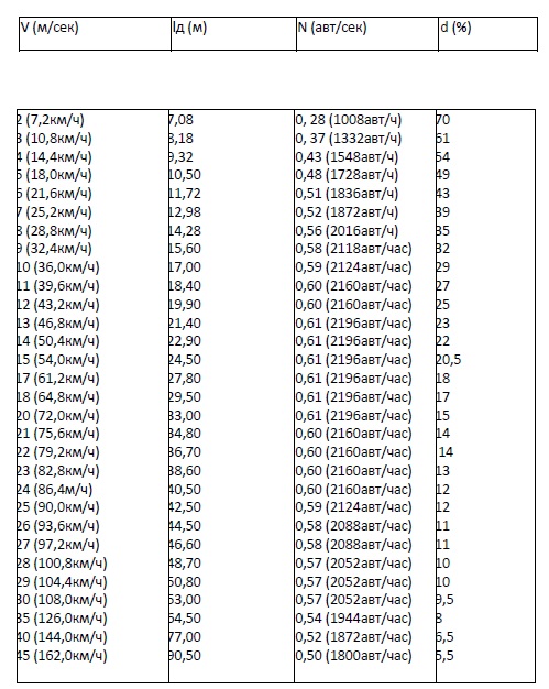 Для иллюстрации приведем таблицу, в которой показана зависимость динамической длины lд, пропускной способности полосы движения N и плотности транспортного потока от скорости движения автомобиля V в интервале скоростей от 2 м/сек(7,2км/час) до 45 м/сек (162км/час) для городских условий, то есть при τз = 1 сек на магистралях.