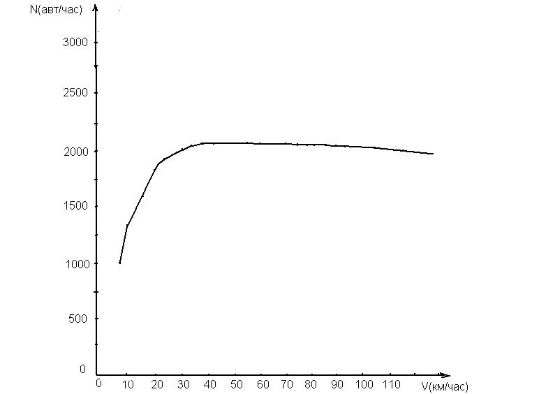 Графически зависимость пропускной способности N от скорости движения транспортного потока показана ниже. Из графика видно, что пропускная способность увеличивается примерно в два раза – с тысячи автомобилей в час на одной полосе движения и примерно до двух тысяч автомобилей в час при увеличении скорости от 7 км/час до 30 км/час, затем до 45 км/час идет медленный рост пропускной способности до 2200 тысяч автомобилей в час, эта величина пропускной способности сохраняется до скорости 72 км/час, а потом происходит медленное снижение пропускной способности до 1800 автомобилей в час при скорости 162 км/час. Таким образом, наиболее выгодный режим движения, с точки зрения использования пропускной способности полос движения, начинается с 30 км/час. Однако если при скорости 30 км/час по полосе движения 2000 автомобилей за час проезжают только 30 км, то те же 2000 автомобилей при скорости 90 км/час проезжают уже в три раза большее расстояние. Поэтому, с точки зрения экономичности и быстроты перемещения выгоднее всего выбирать более скоростной режим, но при этом, не выходя за предел в 100 км/час с точки зрения безопасности движения.