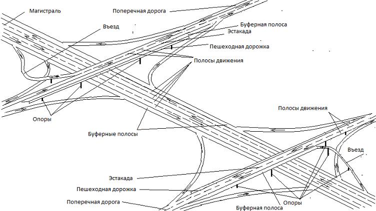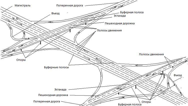 Над магистралью над перекрестком перебрасывается легкая эстакада на стальном каркасе с одной буферной полосой, двумя полосами движения в одну сторону движения и въездом с магистрали, по которой автомобили могут пересечь магистраль, причем этот вариант позволяет исключить левый поворот с магистрали, чтобы не замедлять движение. На следующем перекрестке или переезде эстакада устанавливается для организации переезда над магистралью в обратном направлении. И так далее. Тем самым, конструкция упрощается, удешевляется, позволяет установить на магистрали безостановочное движение и, вместе с тем, практически не нарушает поперечный транзит автомобилей и пешеходов. В зависимости от предполагаемой разницы загрузки эстакады автомобилями со стороны магистрали и со стороны подходящей к ней улицы число полос движения должно этому соответствовать. То есть на эстакаду с боковой улицы или дороги может выводиться одна или две полосы (см. рисунки ниже).