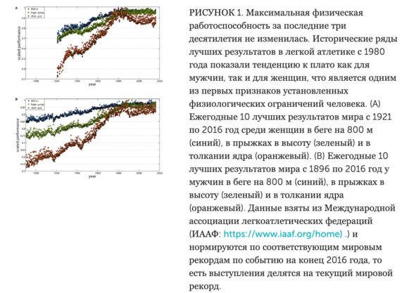 Кроме того, я утверждаю, что показатель продолжительности жизни сегодня более консервативен, чем пластичен, и уже зависит более от ранее заложенных механизмов организации биологии продолжительности жизни вида, чем старения. В качестве подтверждения своей позиции, я приведу пример плато роста максимальной физической работоспособности человека, который последние три десятка лет стоит на месте.