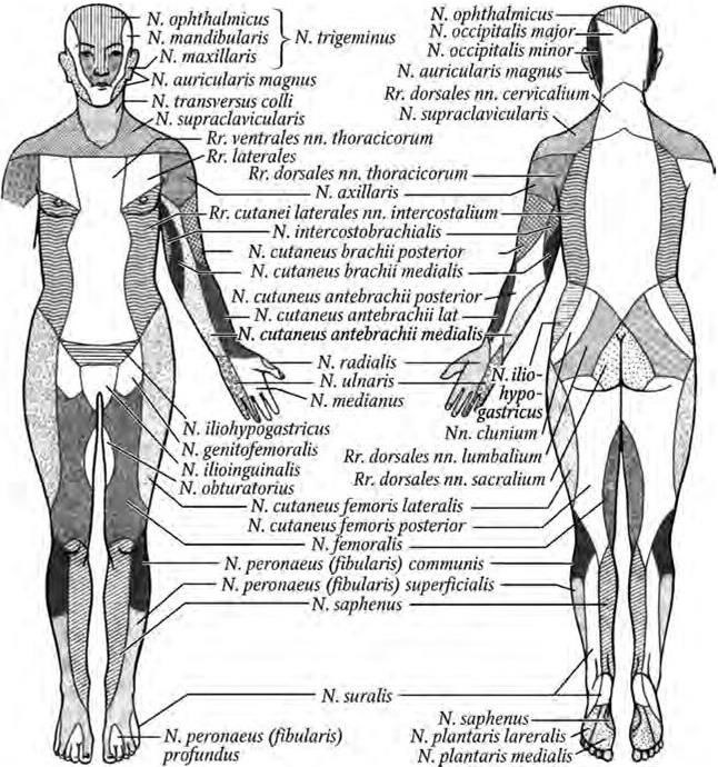 Рис. 1.3. Распределение кожной чувствительности соответственно периферическим нервам (по П. Дуусу)