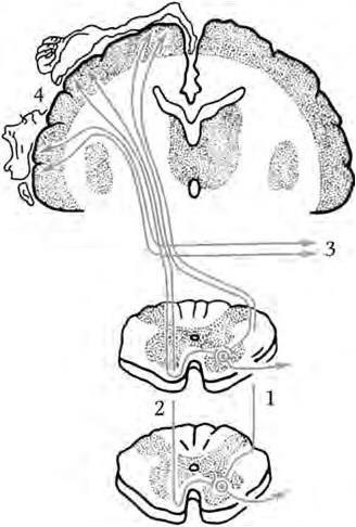 1 – латеральный (перекрещенный) пирамидный пучок; 2 – прямой (неперекрещенный) пирамидный пучок; 3 – корково-ядерные волокна; 4 – проекция двигательной сферы в передней центральной извилине коры головного мозга