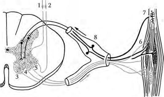 1 – пирамидный путь; 2 – ретикулоспинномозговой путь; 3 – α1-мотонейрон; 4 – α2-мотонейрон; 5 – γ-мотонейрон; 6 – мышечное веретено; 7 – сухожильный рецептор; 8 – чувствительный нейрон