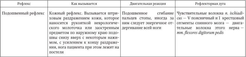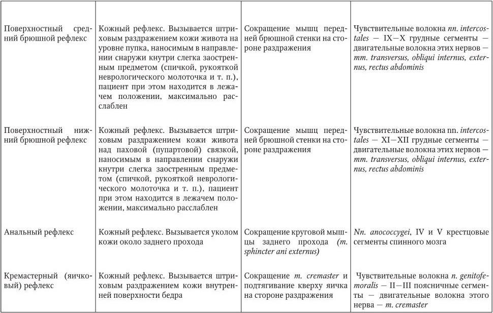 Поверхностные рефлексы подразделяются на кожные и со слизистых оболочек (табл. 2.2). Поверхностные рефлексы вызываются прикосновением, штриховым раздражением, уколом кожи или слизистых оболочек. При неврологическом осмотре необходимо проверять следующие поверхностные рефлексы.