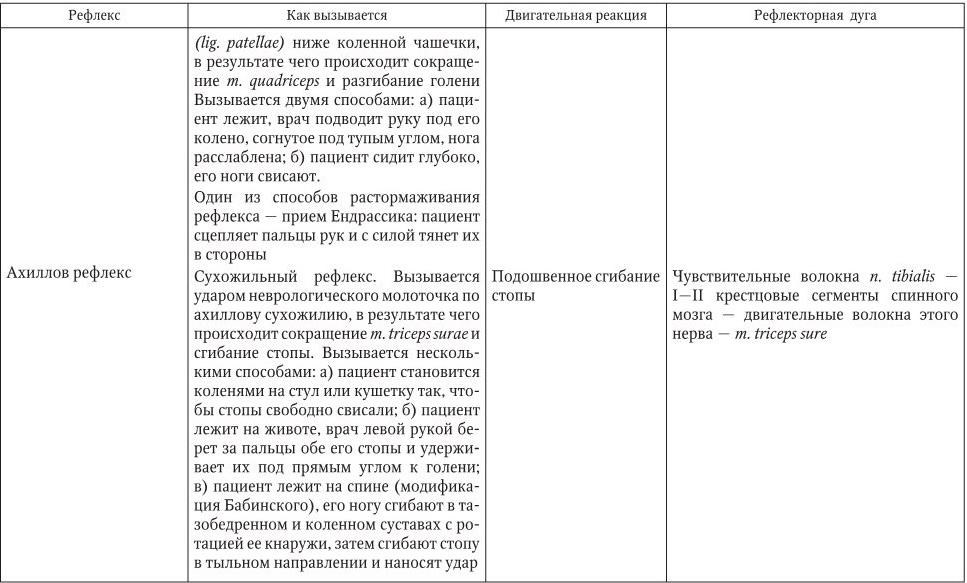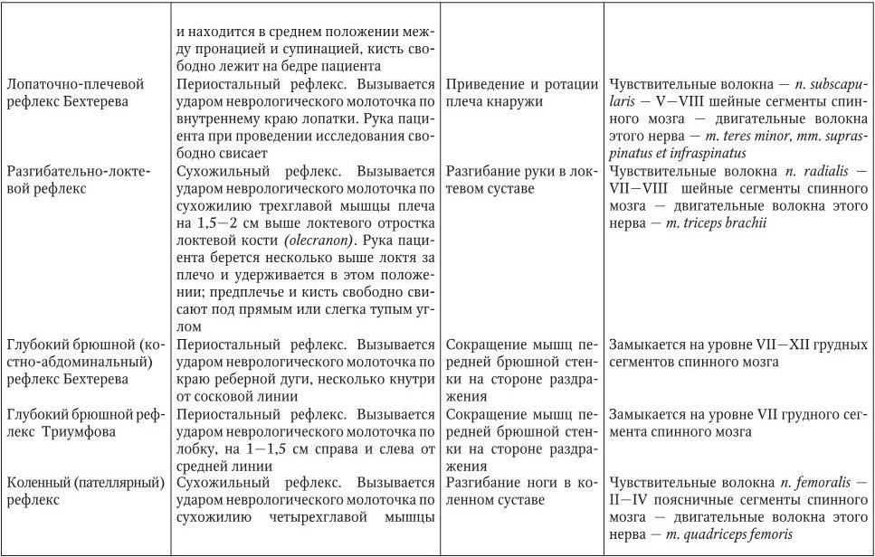 В клинической практике обычно исследуют следующие сухожильные и периостальные рефлексы (табл. 2.3).