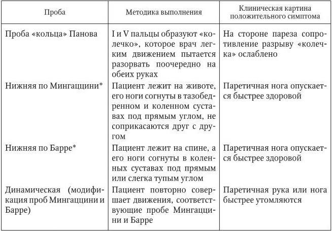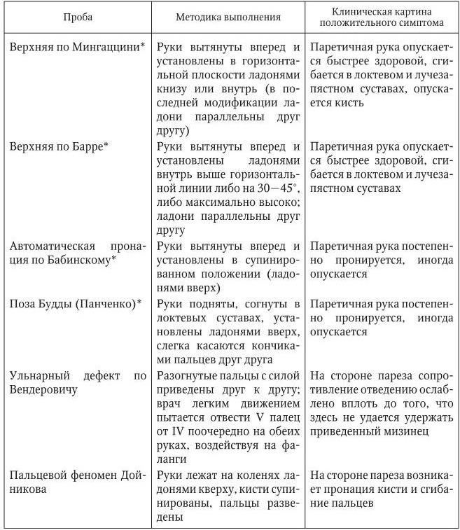 С помощью этих тестов можно выявить мышечную слабость, которую больной субъективно еще не ощущает («скрытые парезы»). Пробы желательно проводить как при обычном, так и, особенно, при диспансерном неврологическом осмотре. Методика их выполнения представлена ниже (табл. 2.4).