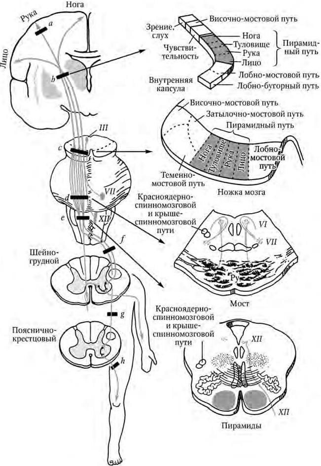 Рис. 2.3. Клинические синдромы прерывания двигательных путей (по П. Дуусу)