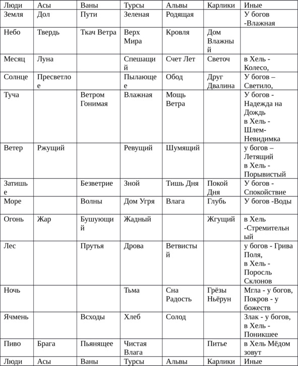 Некоторое представление об обитателях миров можно получить, рассмотрев следующую таблицу, составленную мной на основе текста «Речей Альвиса».