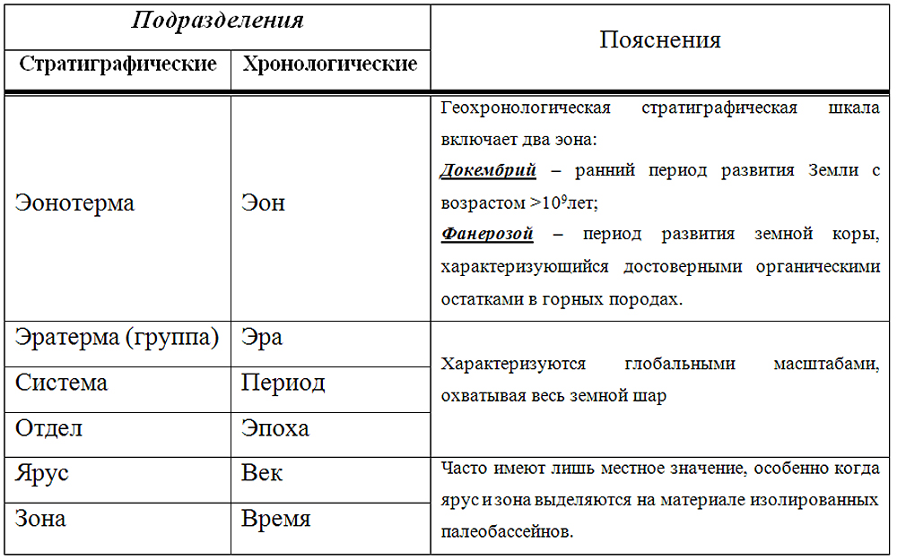 Подразделения этой шкалы были утверждены в 1881г. на 2-м Международном геологическом конгрессе в Болонье и с тех пор являются общепринятыми во всем мире. В дальнейшем, благодаря совершенствованию методов исследования и накоплению новых данных, в первоначальную схему геохронологии земли вносят некоторые изменения и уточнения. По традиции названия подразделений шкалы включают стратиграфическую (отражающую, в основном, относительный геохронологический подход) и хронологическую (ориентированную на абсолютный геохронологический подход) терминологию. В Таблице П.1.1 приведена иерархия соподчиненности принятых подразделений.