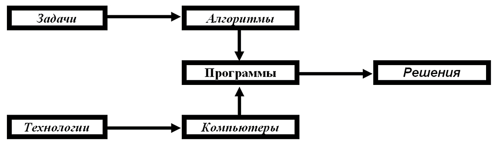 Первое из этих направлений обеспечивает пользователям возможности описания решения своих задач без глубокого погружения в знания структуры вычислительной установки. Это создает также возможности создания универсальных библиотек программ решения различных задач. Не у кого не вызывает сомнения актуальность и значимость такого подхода формирования программного обеспечения для развития активно идущих процессов информатизации общества. Вместе с тем некоторая текущая общественная эйфория, связанная с общими достижениями процессов информатизации, на наш взгляд, несколько деформирует феноменологическую значимость отдельных конкретных программных продуктов. Здесь, вероятно, сказывается определенная инфантильность общества в осознании соответствия внутренних процессов информатизации на основе вычислительной техники. Пожалуй, уместно напомнить обобщенную организацию процессов информатизации.