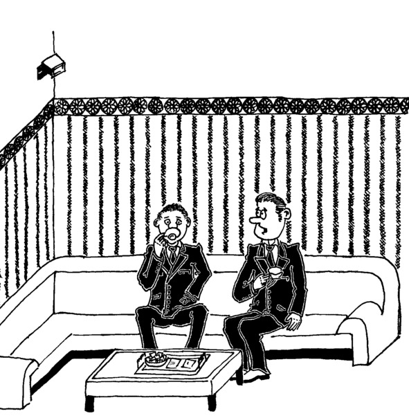 – Пожалуйста, – говорила секретарша, поднося к рукам мужчинам чашки, на что те отвечали, тянувшись за чаем «Спасибо».