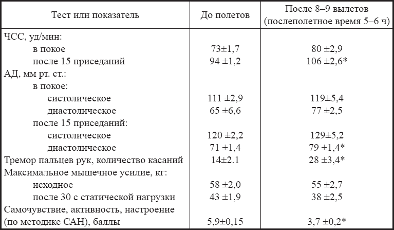Результаты психофизиологического обследования (табл. 2.6.) позволили определить, что к концу летной смены после выполнения 8–9 вылетов, даже через 30–40 мин после завершения полетов не происходило нормализации показателей сердечно-сосудистой системы, особенно на фоне выполнения физической нагрузки, практически в 2 раза увеличивался тремор пальцев рук, существенно изменялись самочувствие, активность и настроение.