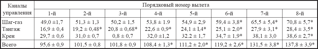 Для оценки динамики функционального состояния летчика в зависимости от количества боевых вылетов в прохладное время года было проведено психофизиологическое обследование летного состава до и после выполнения вылетов, которое сопоставлялось с данными средств объективного контроля, характеризующими динамику управляющих движений на этапе посадки.