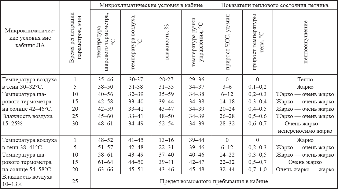 В зависимости от переносимости высоких температур продолжительность качественного выполнения полетного задания уменьшалась в среднем до 1,5–3 ч при 30°С, а при отказе системы кондиционирования воздуха в солнечный день и температуре в кабине ЛА 45°С – до 1–2 ч, при температуре 50°С – до 40–90 мин.