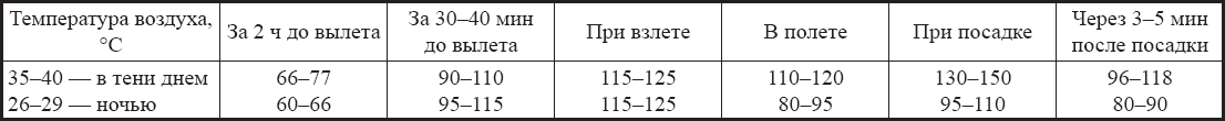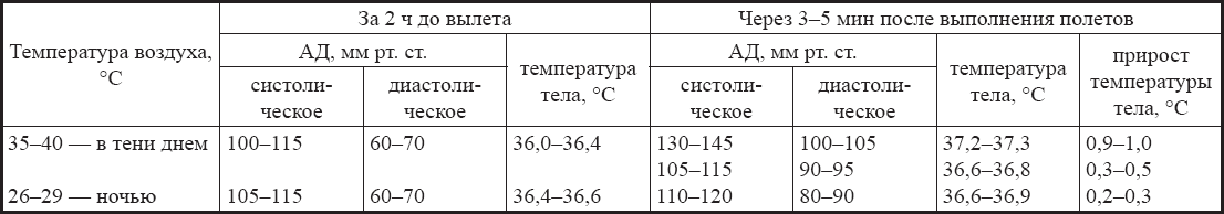В соответствии с медицинскими рекомендациями в период интенсивной внешней температурной нагрузки рекомендуется начинать работу на час раньше (в 7 ч) с перерывом с 12.00 до 16.30, т. е. использовать относительно прохладное время суток. Такой распорядок поддерживается при проведении полетов в летний период в Средней Азии: начинаются полеты рано утром и прекращаются при повышении температуры до 35°С в тени. В условиях Афганистана реально допустимым пределом, при котором разрешались боевые вылеты, была температура 42°С в тени.