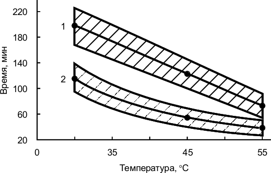 Рис. 2.2. – Возможная продолжительность выполнения полетного задания при повышенной температуре воздуха в кабине летчиками (137 человек) с хорошей (18% – 1), удовлетворительной (65% – 2) и низкой (17% – 3) переносимостью высоких температур