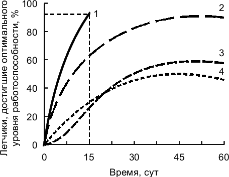 Рис. 2.3. – Зависимость числа летчиков, достигших оптимального уровня работоспособности, от времени перебазирования в Афганистан: 1 – в феврале; 2 – в сентябре; 3 – в мае; 4 – в июле