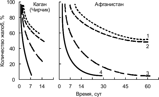 Рис. 2.4. – Динамика снижения общего количества жалоб летного состава в зависимости от времени перебазирования в Афганистан: 1 – в феврале; 2 – в сентябре; 3 – в мае; 4 – в июле