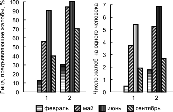 Рис. 2.5. – Сравнительная характеристика числа летчиков, предъявлявших жалобы, и количества жалоб на одного человека в зависимости от времени перебазирования в Узбекистан (1) и в Афганистан (2)