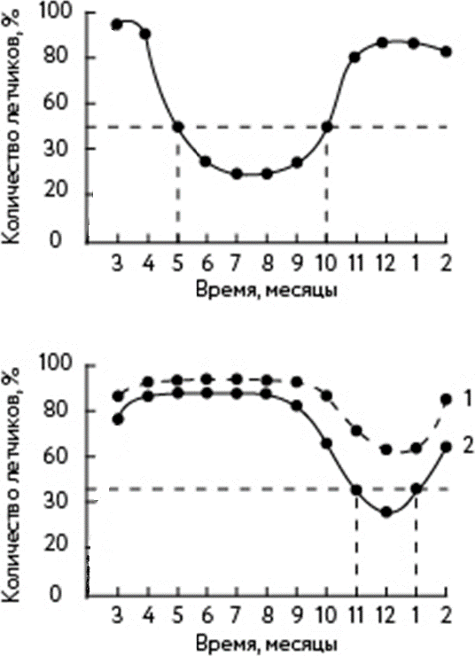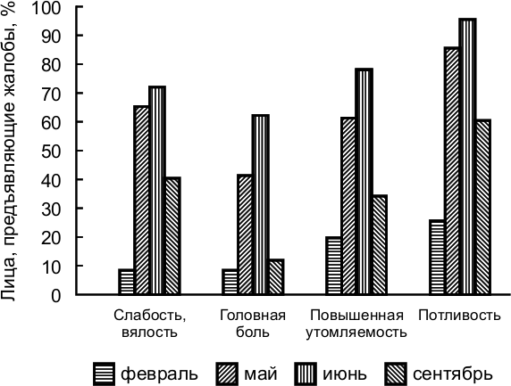 При замене в мае-июле 85–90% летчиков предъявляли ежедневно по 6–7 жалоб на головную боль, нарушение сна, слабость, повышенную утомляемость, ощущение перегревания, жажду, повышенную потливость и т. д. в течение двух-трех месяцев. При замене в сентябре 65–70% летчиков предъявляли по 3–4 жалобы ежедневно на протяжении трех-четырех недель. При замене в феврале 30% летчиков предъявляли по 1–2 жалобы на протяжении 10–14 дней (рис. 2.5, 2.6).