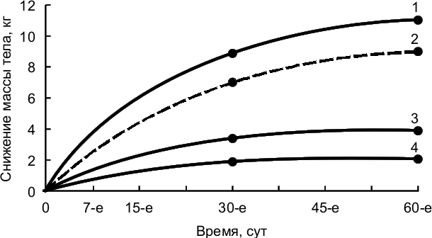 Рис. 2.7. – Динамика снижения массы тела у летного состава в зависимости от времени перебазирования в Афганистан: 1 – в феврале; 2 – в сентябре, 3 – в мае; 4 – в июле
